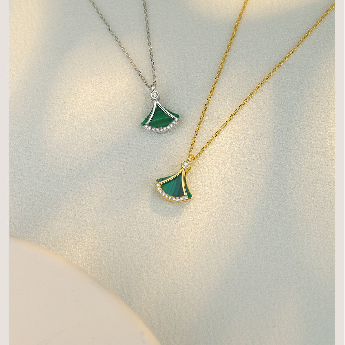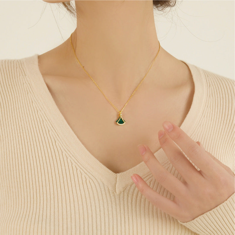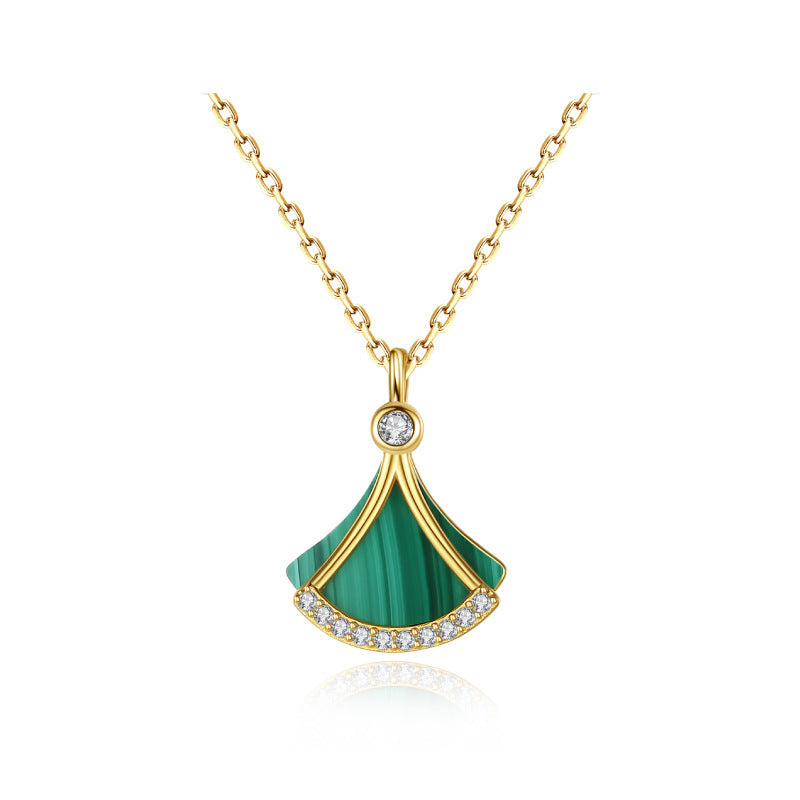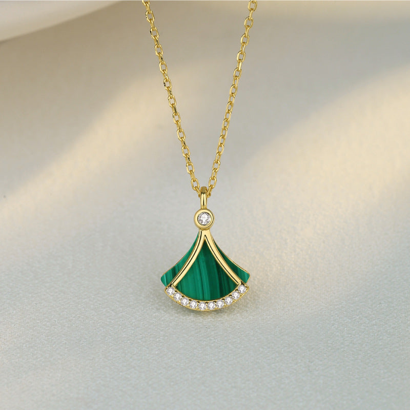 Diese elegante Halskette vereint zeitlose Schönheit mit modernem Design. Der Anhänger, inspiriert von einer fächerartigen Form, strahlt feminine Eleganz und Raffinesse aus. Das Zusammenspiel von goldenen Linien, funkelnden Zirkoniasteinen und der tiefgrünen Malachitfläche schafft ein harmonisches und edles Gesamtbild.